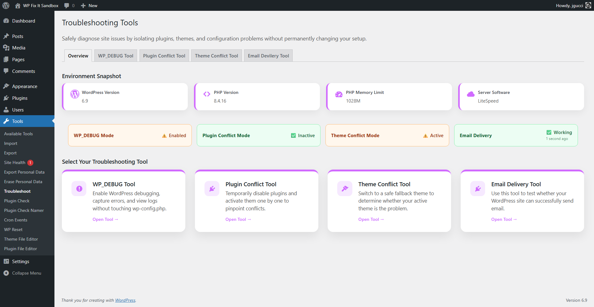- Environment snapshot including WordPress, PHP, memory, and server software